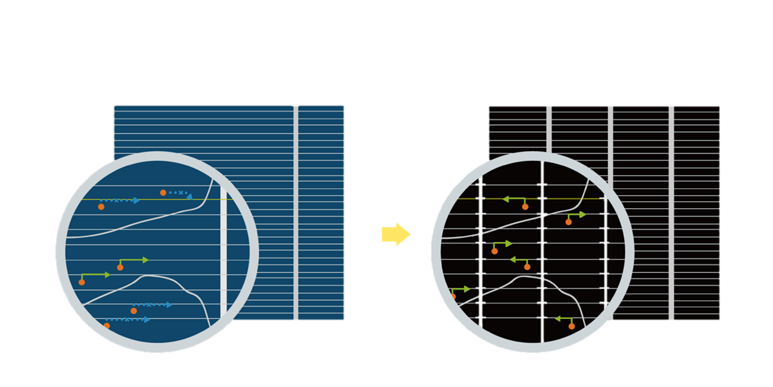 • 多条电极栅结构,可有效降低外力对于电池的影响,限制电池隐裂 (Micro-cracks) 范围,防止电流传输路径 (Current distribution) 之损坏进一步扩大。